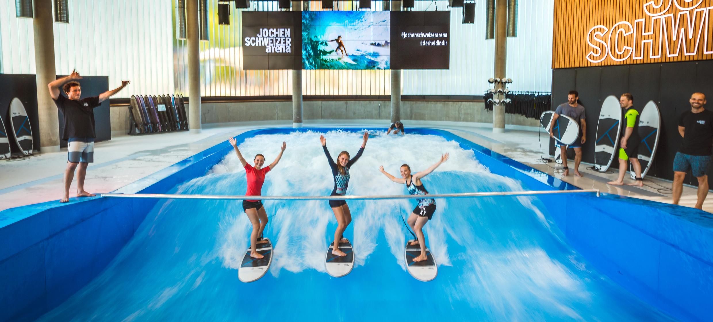 Egal ob Anfänger oder Profi: Genießen Sie in der Jochen Schweizer Arena mit Ihren Kollegen das ultimative Surferlebnis auf der ersten stehenden Indoor-Surfwelle Deutschlands. Ganzjährig, wetterunabhängig und immer bereit, Ihnen ein großartiges Teamerlebnis zu bieten.