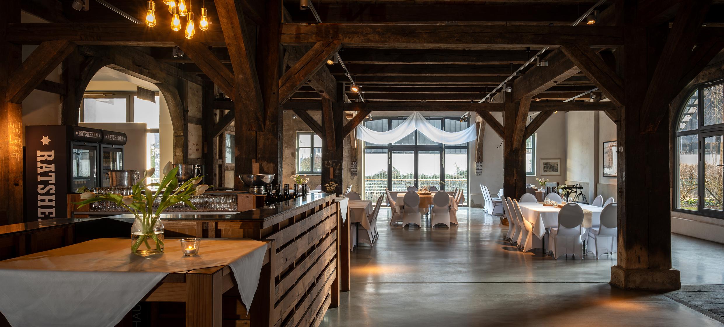 Die Kombination aus Innen- und Außenbereich macht den Speicher am Kaufhauskanal zu einem Highlight. Eine Veranda mit Blick aufs Wasser, ein kleiner Biergarten und eine gepflasterte Außenfläche sorgen für ein idyllisches Ambiente. Dank eines Vertrags-Caterers und einer attraktiven Bar wird jeder Anlass durch kulinarische Highlights abgerundet.
